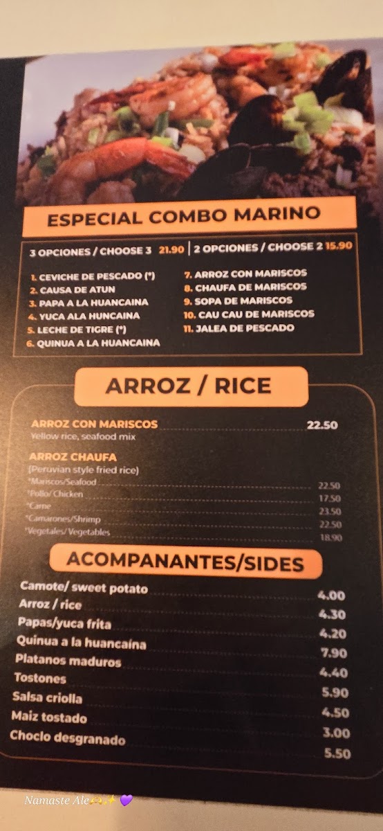 Yellow rice, seafood mix, green onion, peppers, sauce peruvian yellow chilli and cilantro.